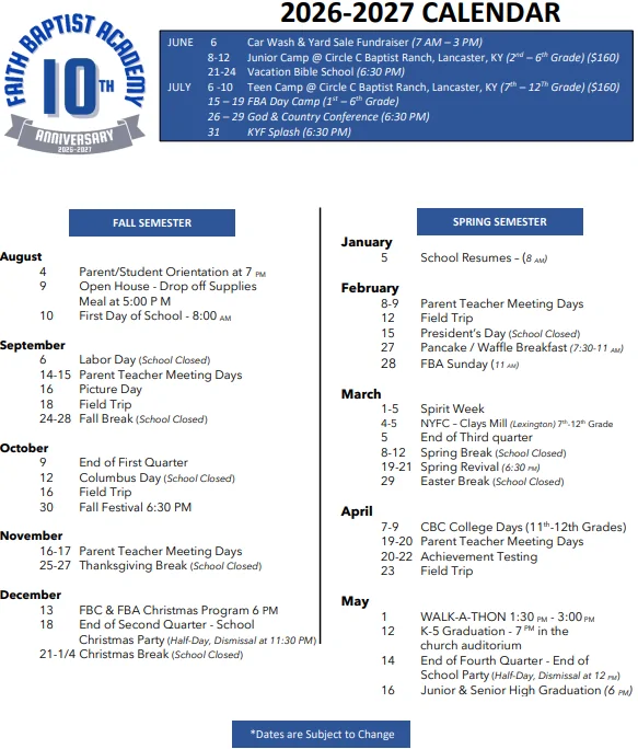 The tuition paid on behalf of our students does not cover the full cost of their education. Without the support of the Faith Baptist Church, free-will gifts, and our fundraising programs, we would not be able to continue our operation. Therefore, it is vital that tuition fees be paid when due and that families participate and lend their full support to our various fundraising efforts.